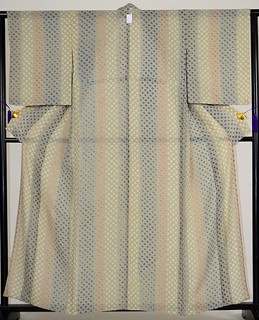 藤色の濃淡が縦に走る現代の結城縮の単衣。