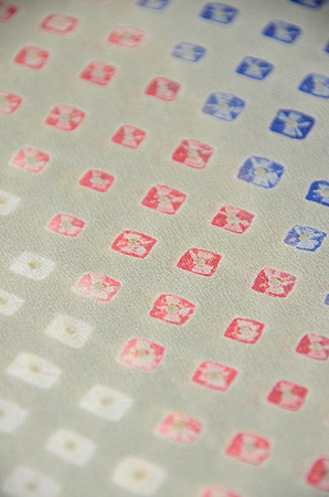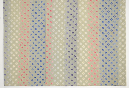 白茶の地に巻き上げ絞りで、赤青白の3色が染められています。