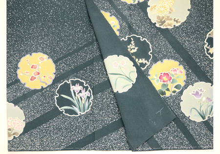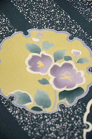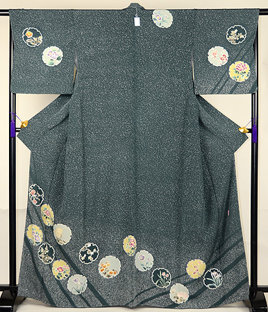 萌黄色の地に、新春は梅に椿、春は牡丹に水仙、秋は女郎花に菊、紅葉という具合に、四季折々の花が雪輪の中に描かれた付下。