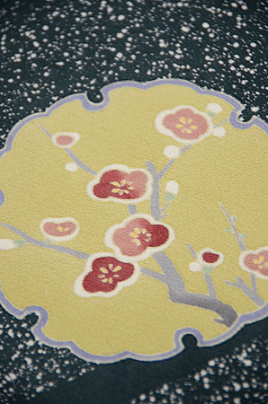 白地にかわいい梅と松葉丸が花の精のように舞い散って、爽やかな空気が伝わってくるようです。
