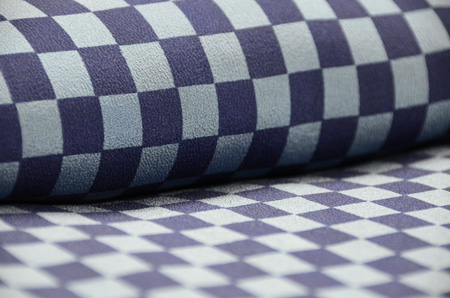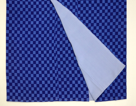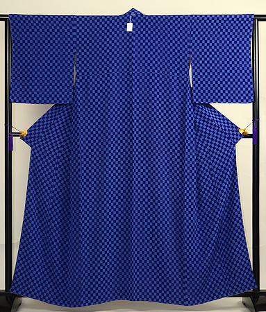 一越縮緬地にブルーの濃淡で、程よい大きさの市松があしらわれています。