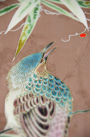 秋も終わり、わずかに残る赤い小さな身と、それを求める気の強そうな百舌鳥が印象的な着物です。