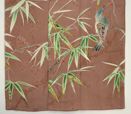 ベージュを基調に、茶と黄茶、そこにピンクが入り、最後にすみれ色の細線がきっちりと締まり、品格の高い仕上がりとなっています。
