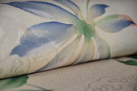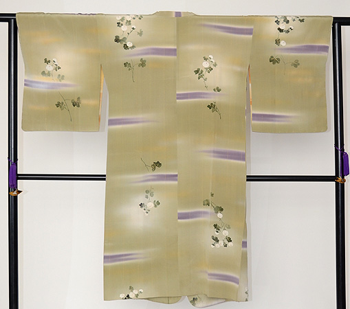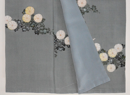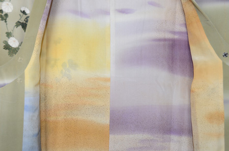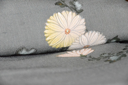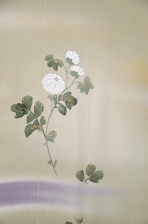 淡い柳色の地に紫苑色の霞、所々にかわいらしい小菊が描かれています。