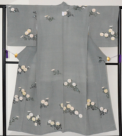 ブルーグレーの縮緬地に白菊が配された、昭和初期の美しい着物です。