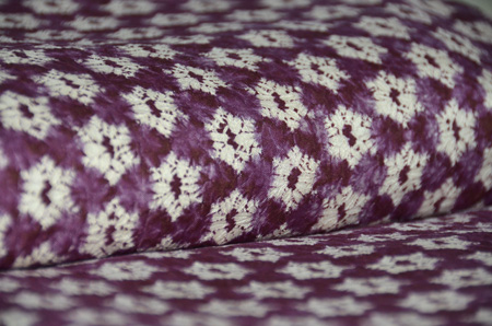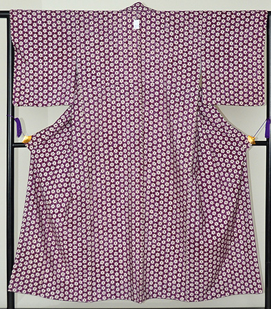 雪の結晶を連想させる可憐な絞り文様が美しい紫根染の袷です。