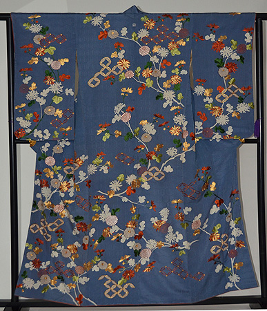 変わり亀甲が連なる綸子地に、白抜き染めと手刺繍で大胆に菊文様と七宝繋ぎ文が表された豪華な着物です。