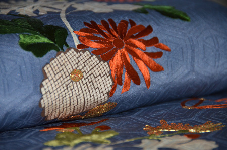 藍染めの優しく深みある地色に天然染料の刺繍が美しく、高貴な華やかさを放っています。