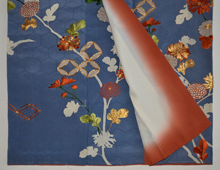 菊や梅、紅葉など四季の花々を刺繍であしらった文様には、全て江戸裂が使われており、壮麗感漂う一着となっています。