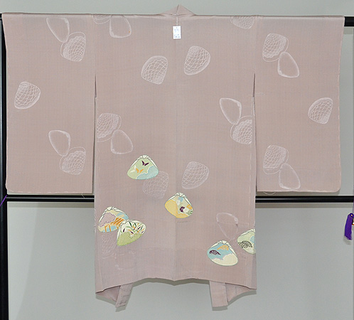 薄紅色の地色に描かれた貝合わせの図柄はお嫁入りの際に仕立てられたのでしょうか。