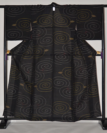 黒地一面に広がるダイナミックな水紋が印象的な麻の着物。