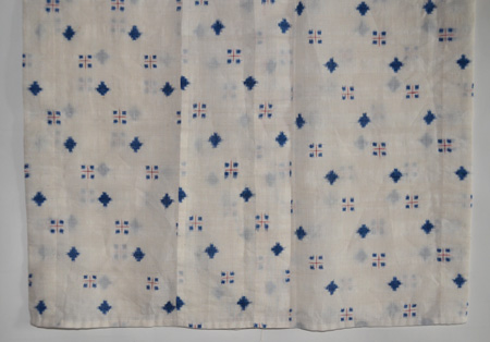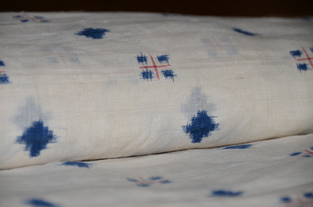 美しい白の地に青、赤の絣文様が冴える、すっきりとした印象の越後上布。