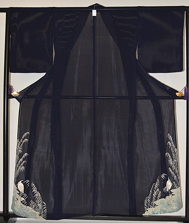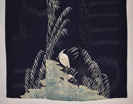 濃紺のたて絽、葦の水辺に白鷺が凛とたたずんでいます。