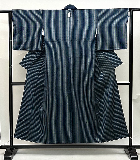 柄が大きいので、藍と小豆色の縦絣が、おさえた色味を出して、落ち着いたバランスの良い感覚的な着物となっています。