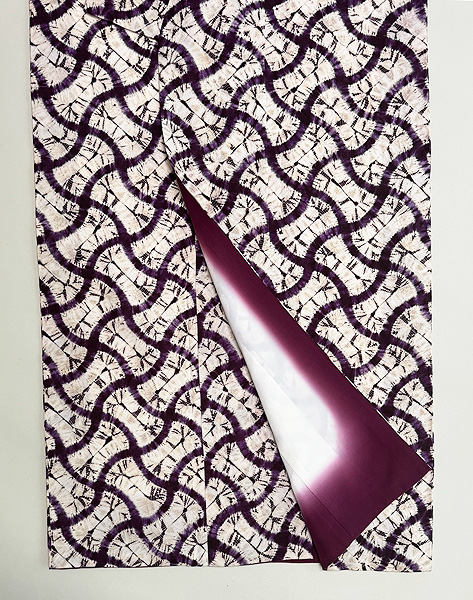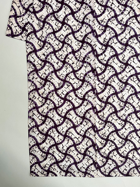 板締めによる絞りがかわいい幾何学文を見せて、スッキリと夏衣裳の着物です。