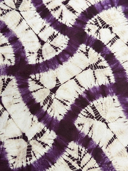 手筋絞りで大きな分銅柄を力強く作り、中に蜘蛛絞りで優しく繊細な模様を出しています。