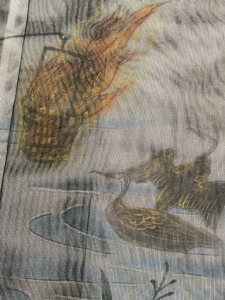 黒の紗の奥に鵜飼の様子を描いた水辺の景色が浮かび上がります。