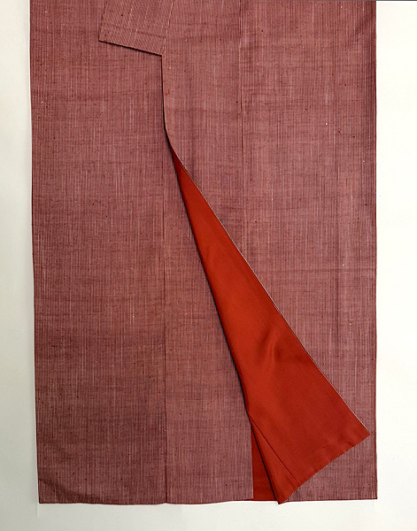 紺色に細い赤の縞の紬は帯次第で女性らしくも、マニッシュにもお召いただけ、かつ上品にまとまる魔法の1枚。