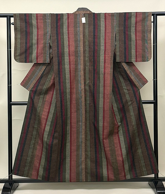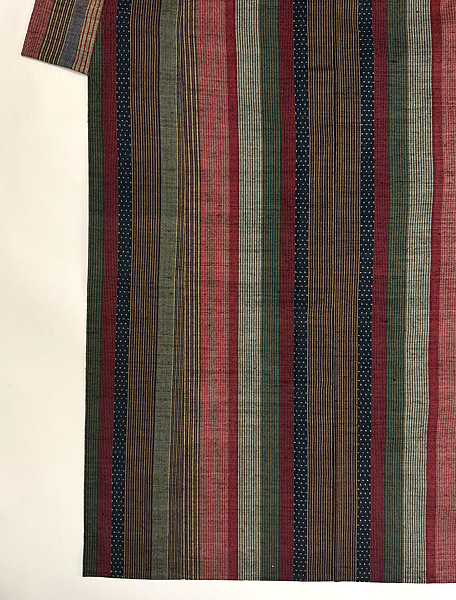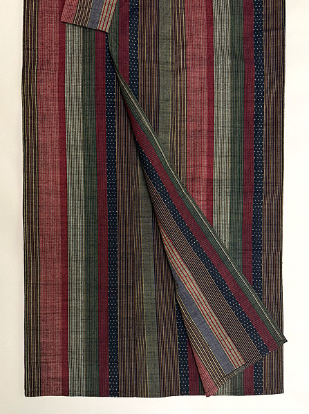 11種類の色や柄の異なった変り縞が織り出された信州紬は存在感がある1着。