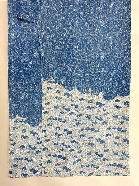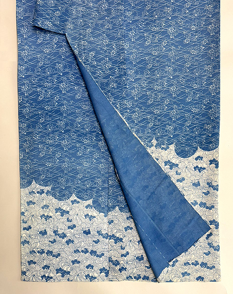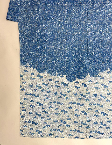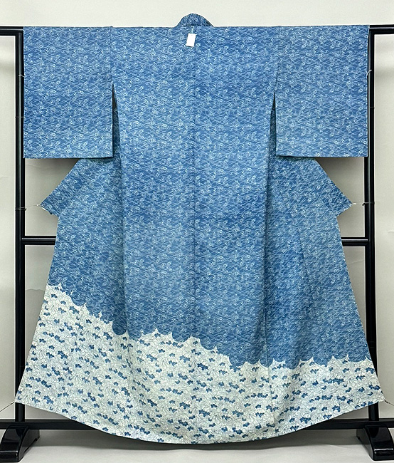 藍の濃淡で大小霰を全体に染め、裾にかけて波濤文をダイナミックに配しています。