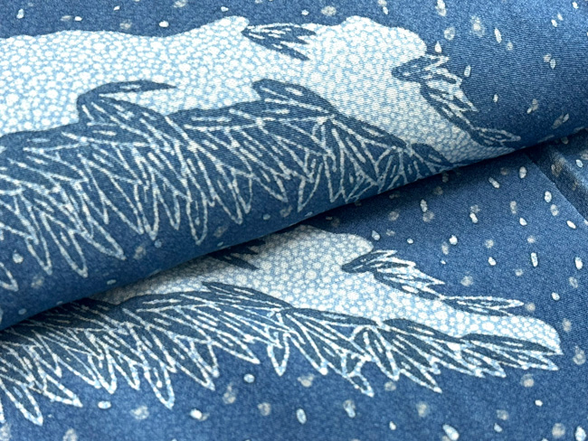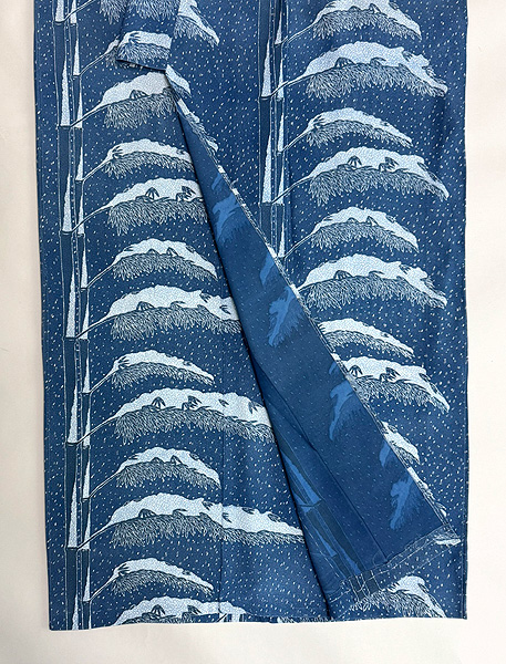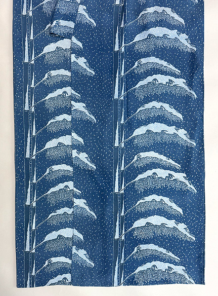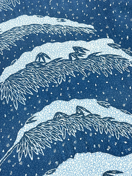 天空のやや濃い目の地色の藍は冬の夜、後づけの糸目糊で、深々と雪の降る様子を表しているようです。