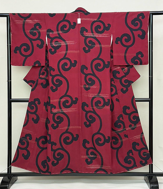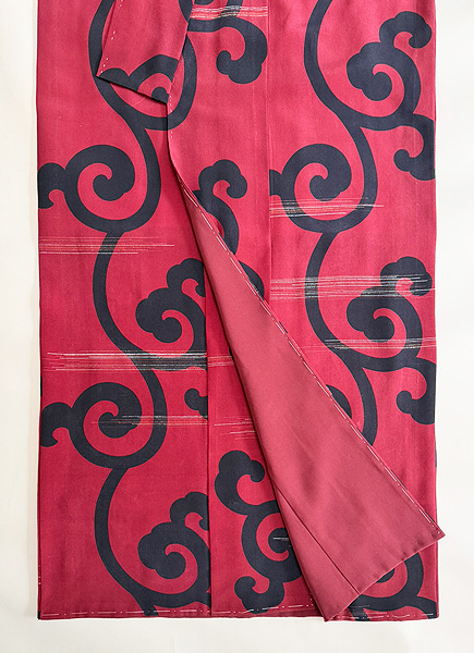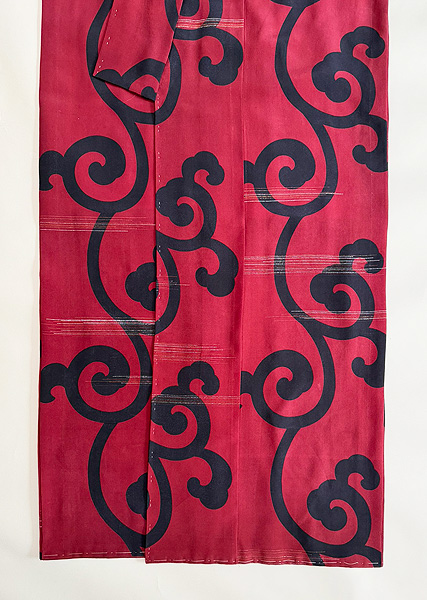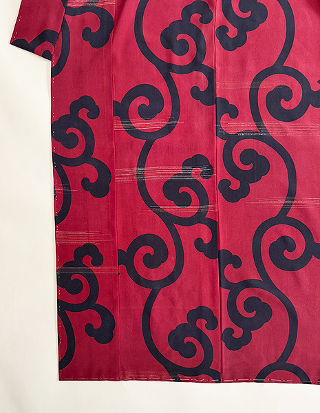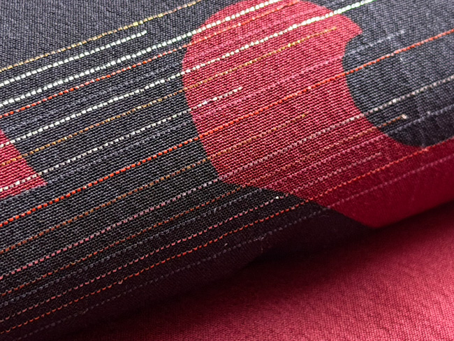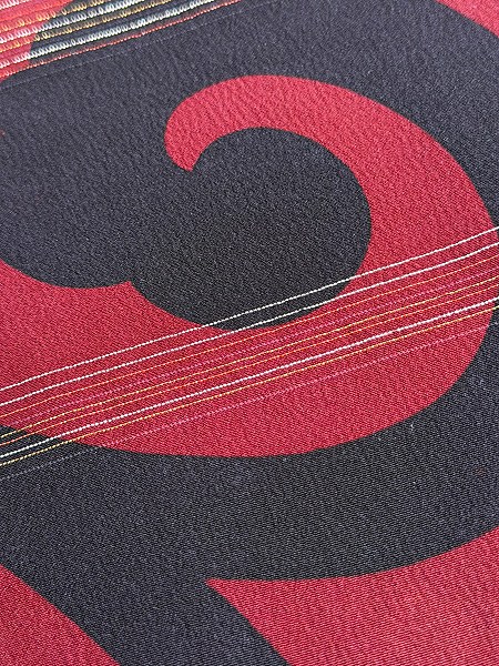 紅殻色に黒の唐草文様というダイナミックな柄は、横段に金通し・銀通しが入ることでぐっと粋な雰囲気になっています。
