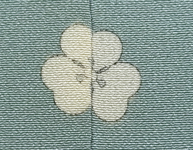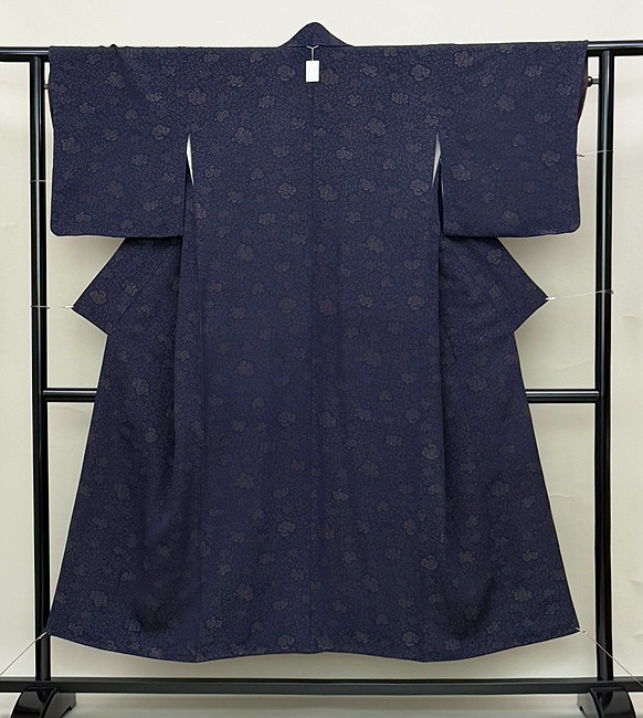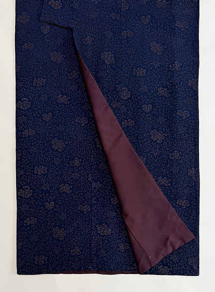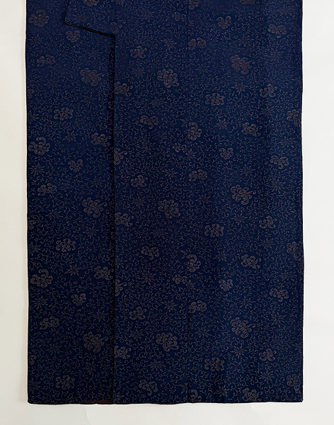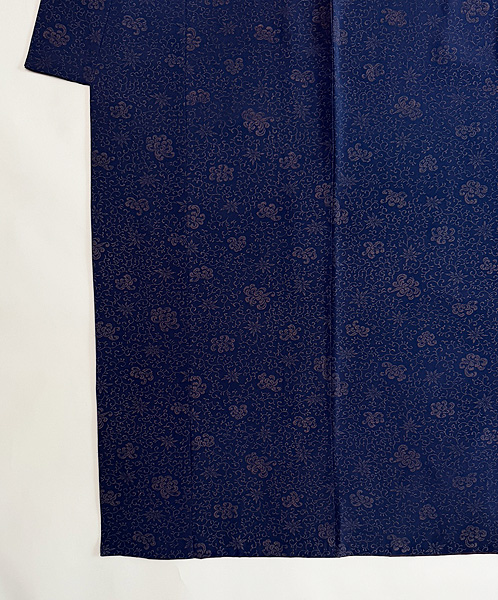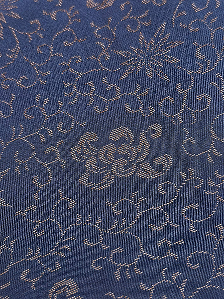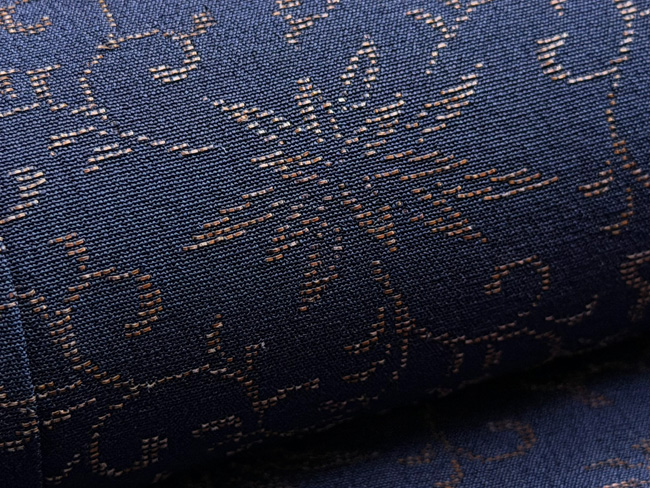 紺地に漆糸で唐草文様を織り出した小紋です。