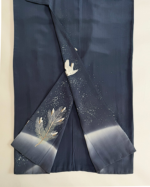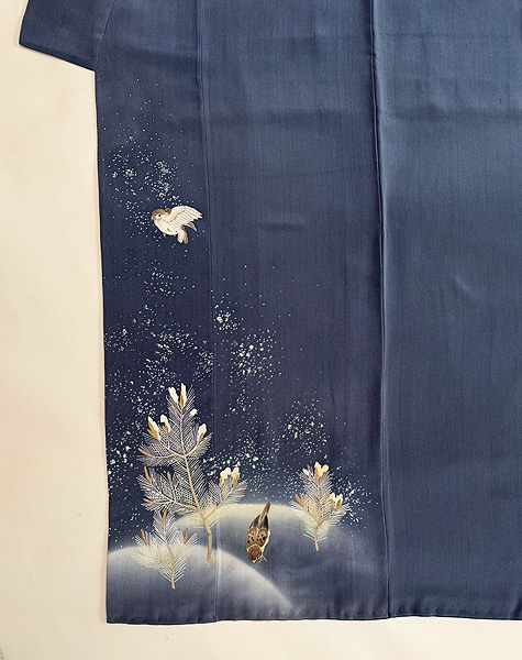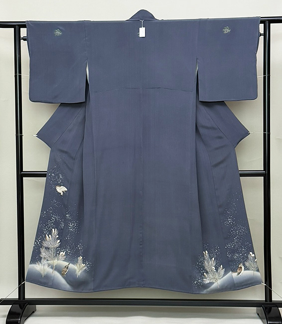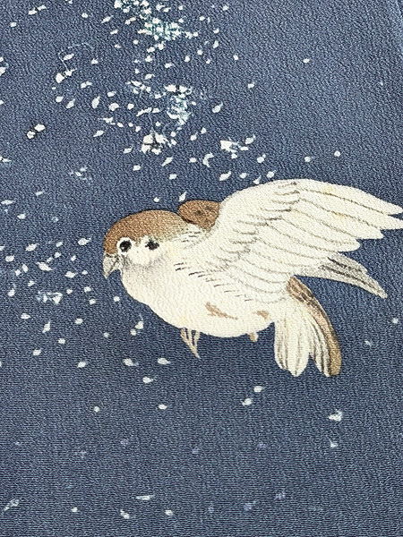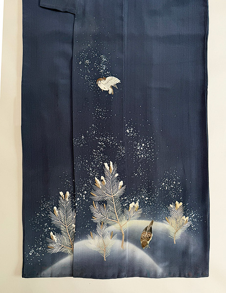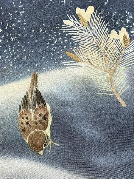 深い色に、雀の羽と散る雪の白が映えて、凛とした品格が印象に残るお着物です。