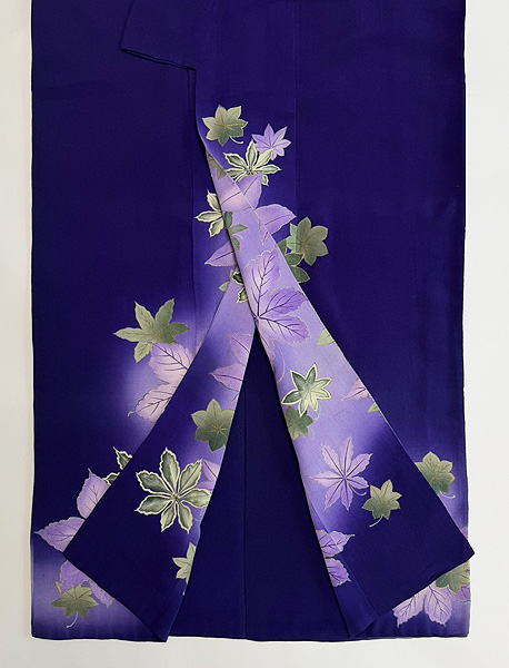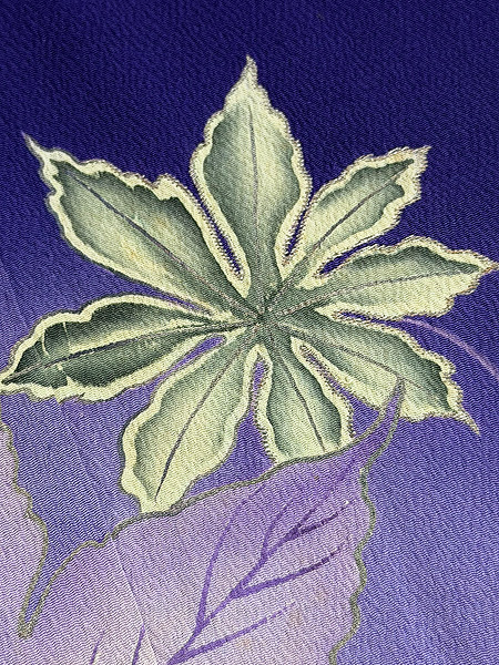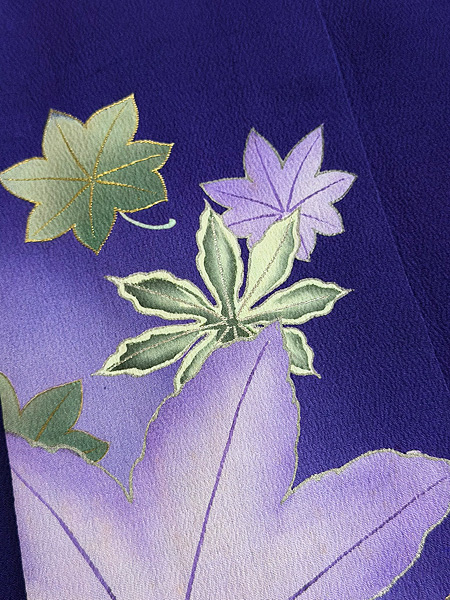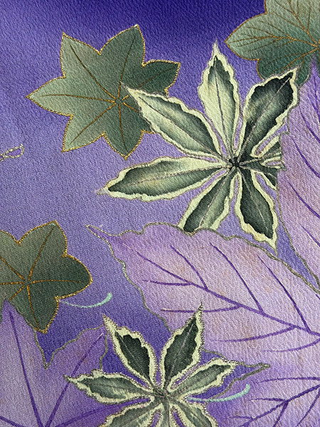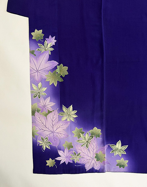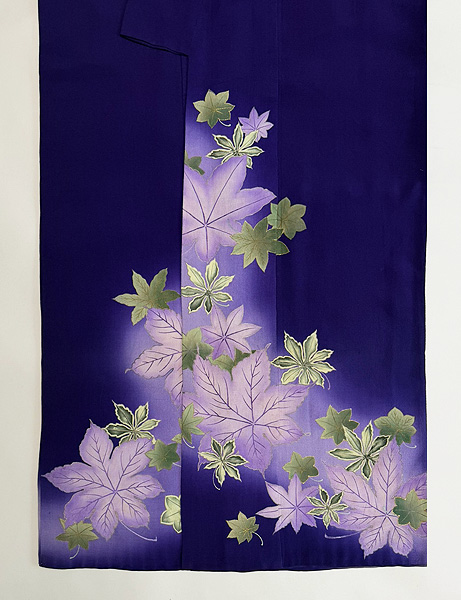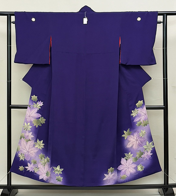 濃紫地の裾にぼかしを入れ、青楓とやつでの葉を散らした、シンプルながら艶やかな色留袖です。