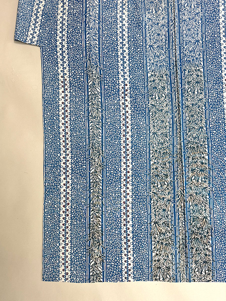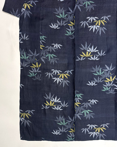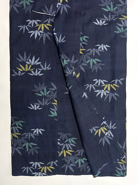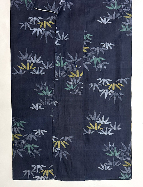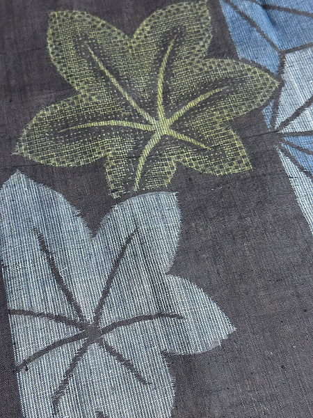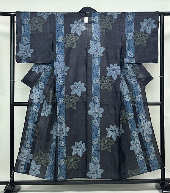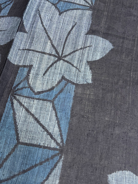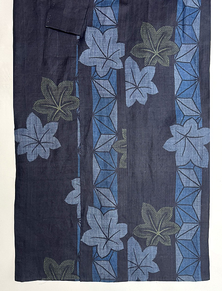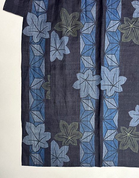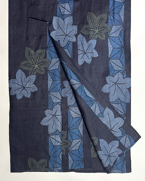 麻の葉文様が孟宗竹のような縦縞に収まって、大きなかえでが散っています。