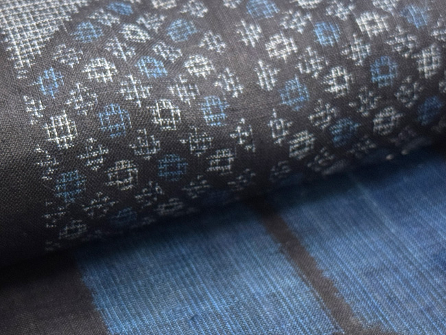 こちらは菱形の絣の中に亀甲文様を配したとても細かい絣の宮古上布です。