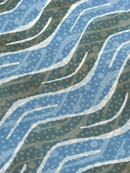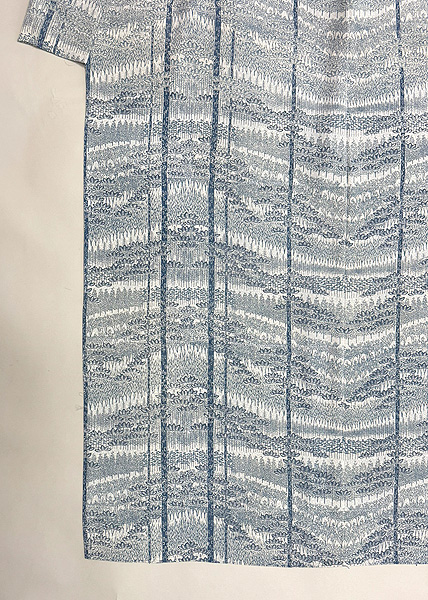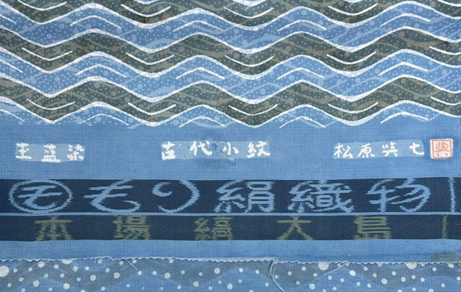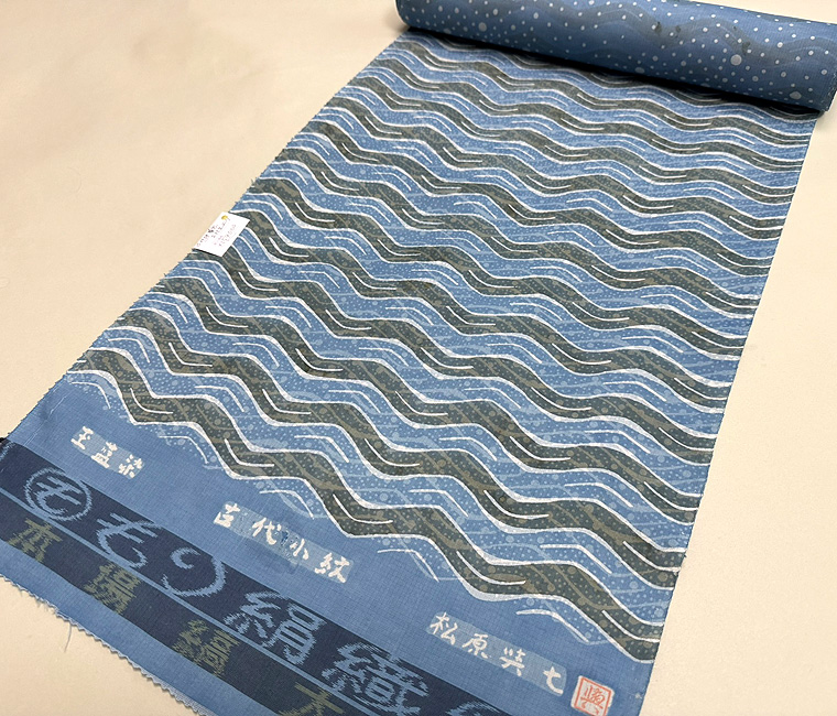 松原与七作 波に変わり大小霰藍型染め 大島着尺(単衣)