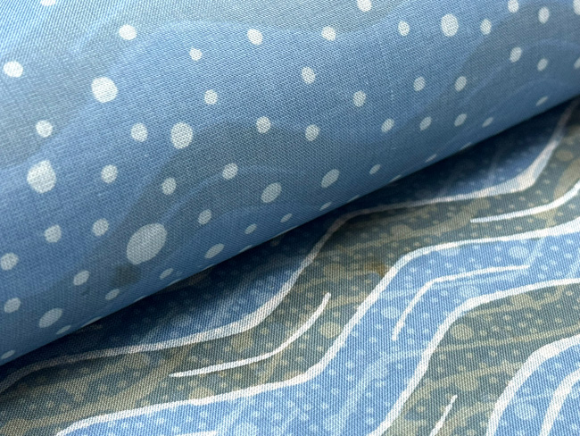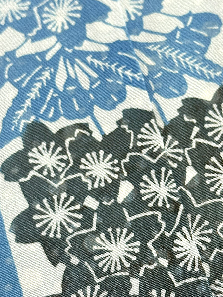 藍染め・タンガラ染めを交互に置いて、裏からのぞく大小霰がまるで海の泡のよう!