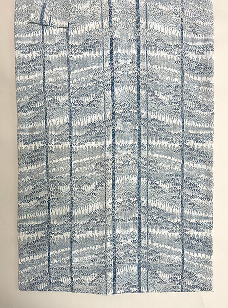 縮緬地に、松の木肌の様な不思議な文様が染め出された縦縞で区切られた中を、整然と樹々の並びをあらわした風景文様。