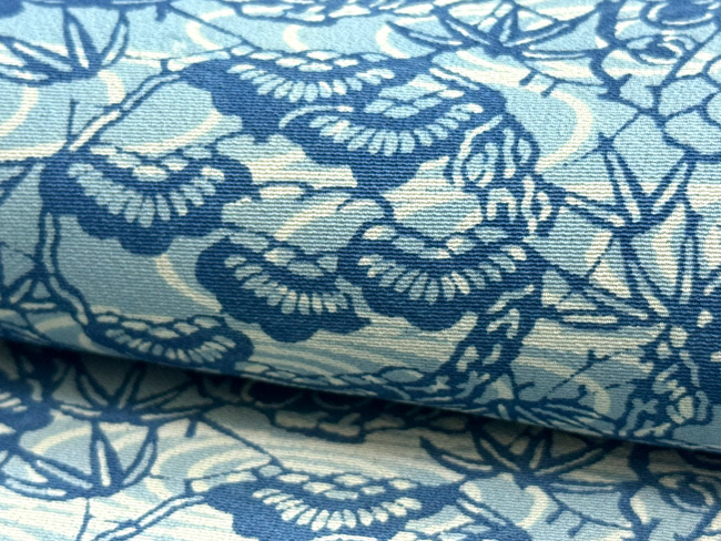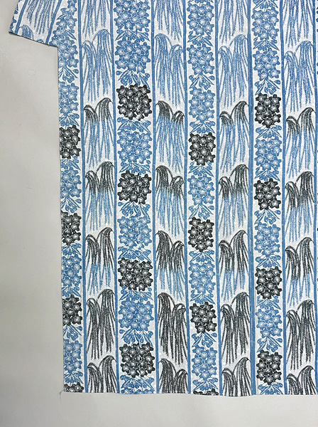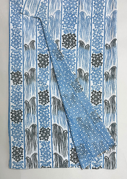 重みのある縮緬地に鮮やかな松原ブルーで染め上げられた、粋でカワイイ桜と柳。
