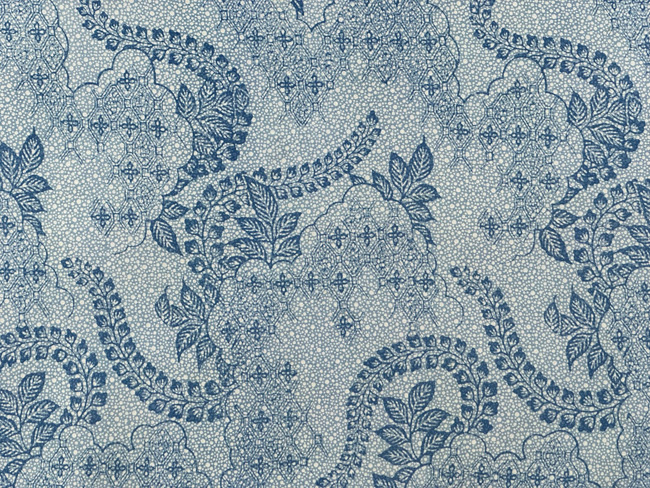 大小霰を白く抜いて、藍で藤丸、雲取りの中に花菱を染め出した手の込んだ小紋。