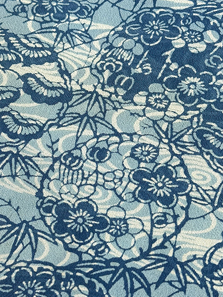 観世水を白く抜いた上から、松、梅の花丸に笹を配して、藍の濃淡で調子を付けた手の込んだ小紋。