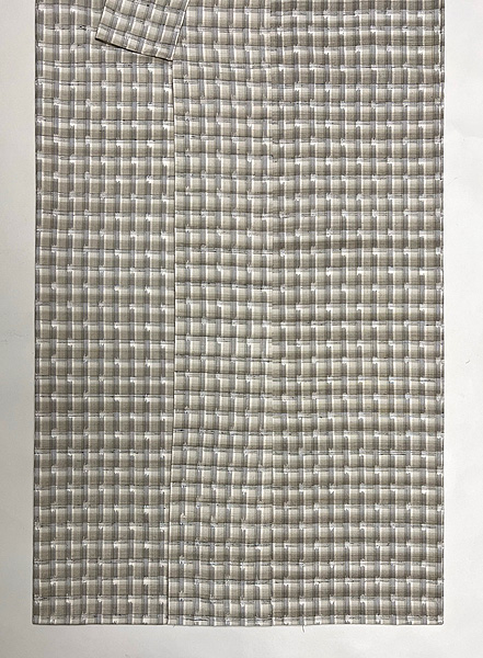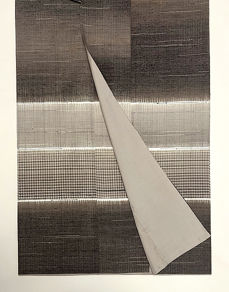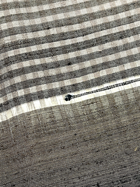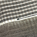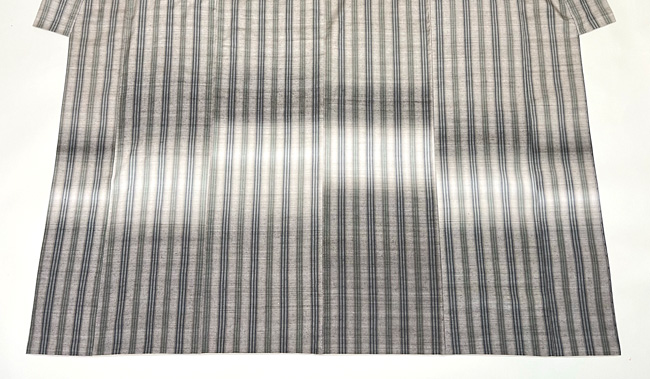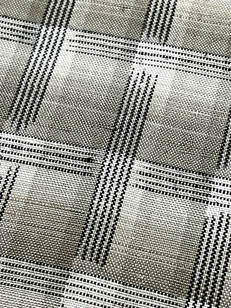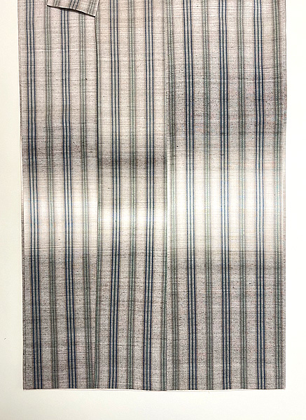 2本どりの黒い糸が交わる糸と交互に交差しているので、ゆらゆらと揺れているような儚げな線となり、その途切れ具合も全くデリケートで、この着物の繊細で硬質的な美しさを表現しています。
