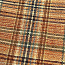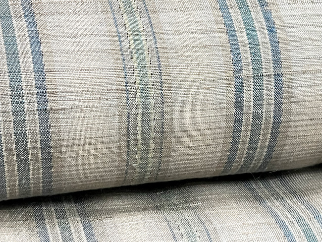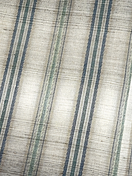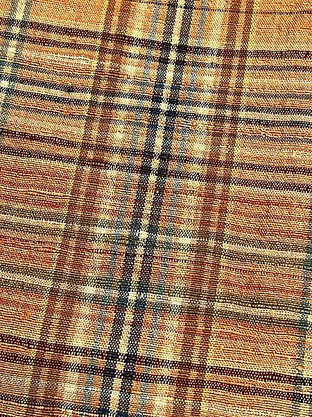 縦糸は琵琶茶という暗くくすんだ辛子色、緯に色糸や繋ぎ糸を入れてきっちりと縞を出しています。
