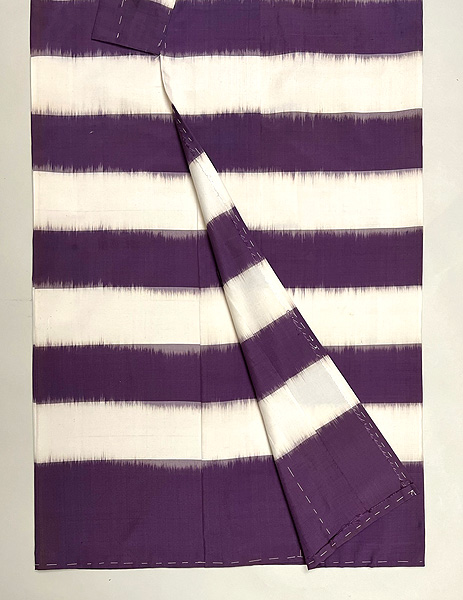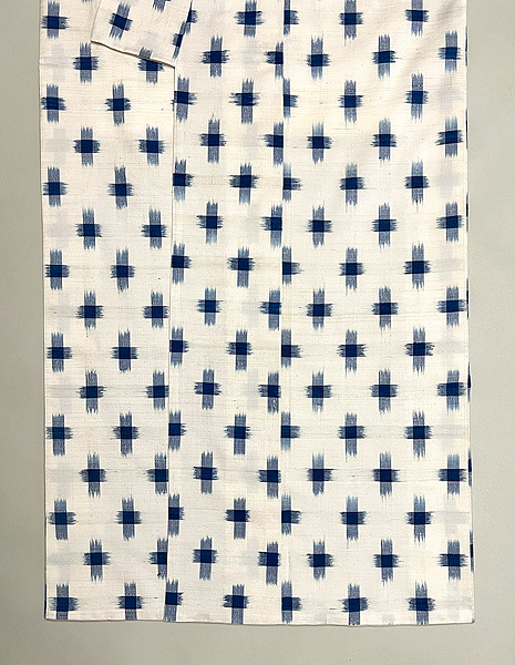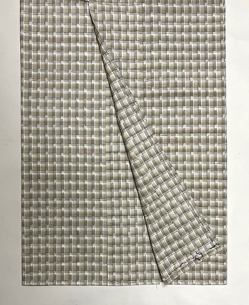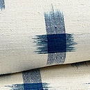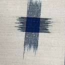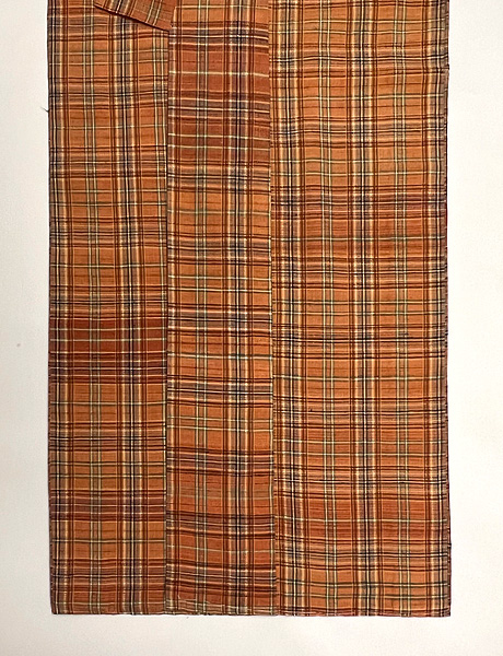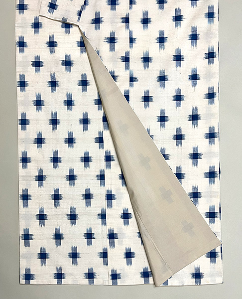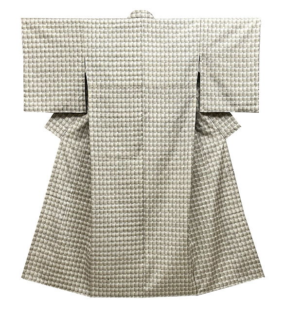 貴船川の清流が、白い線となり、素朴な土色と仙斎茶の小格子の縦絣をそれぞれ、厳かにきっぱりと分け、美しい熨し目文様が生まれています。