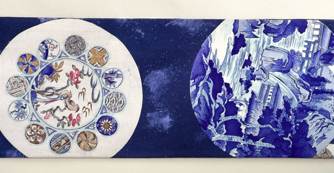 糸目糊で描き、防染して藍瓶で染め、あとから藍棒で線描を入れています。