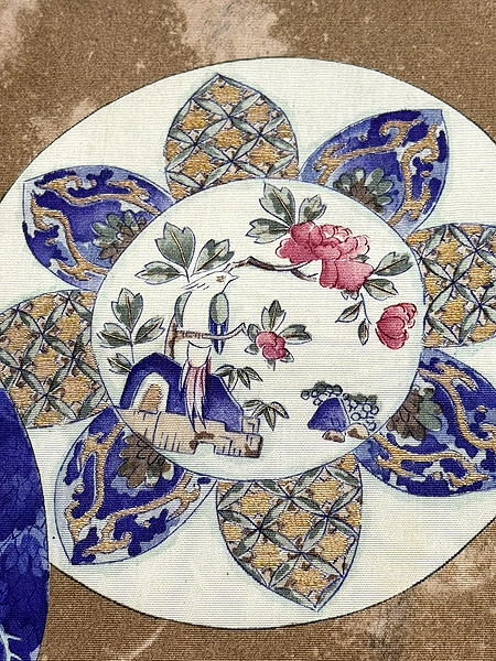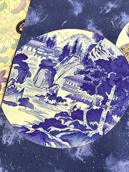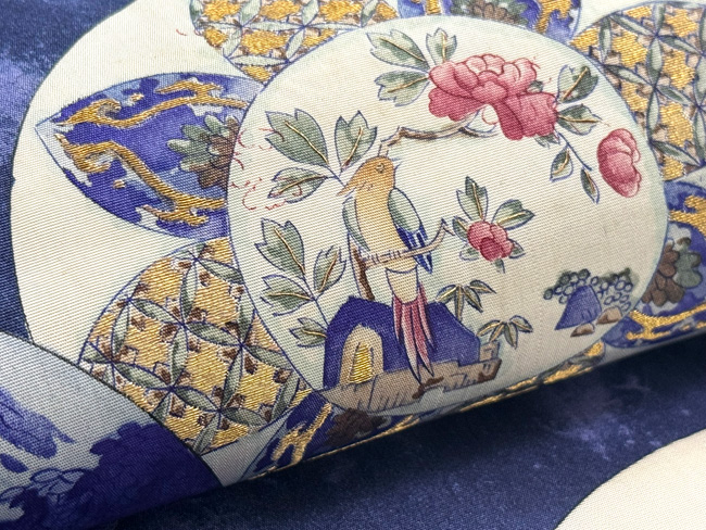 丸文が重なって、楼閣山水や花鳥文など、大陸の情緒漂う名古屋帯です。