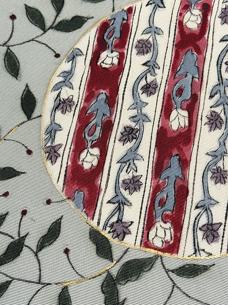 織り込まれた金糸がモアレのように輝いて、刺されたバラが上品にあしらわれています。