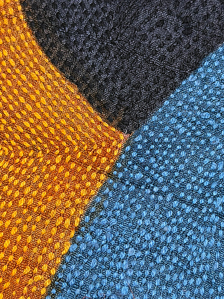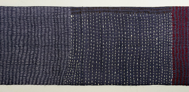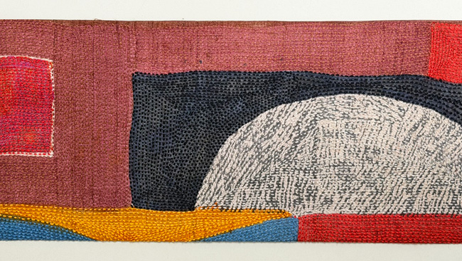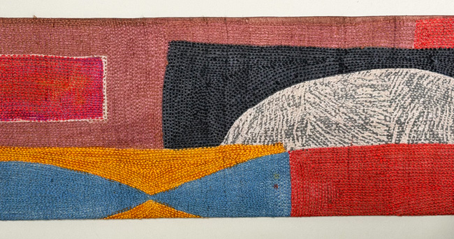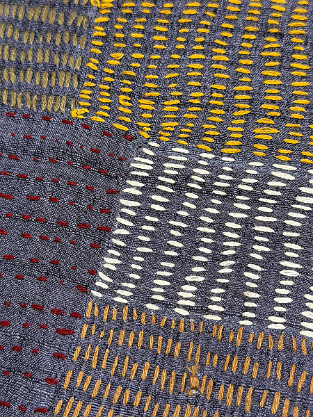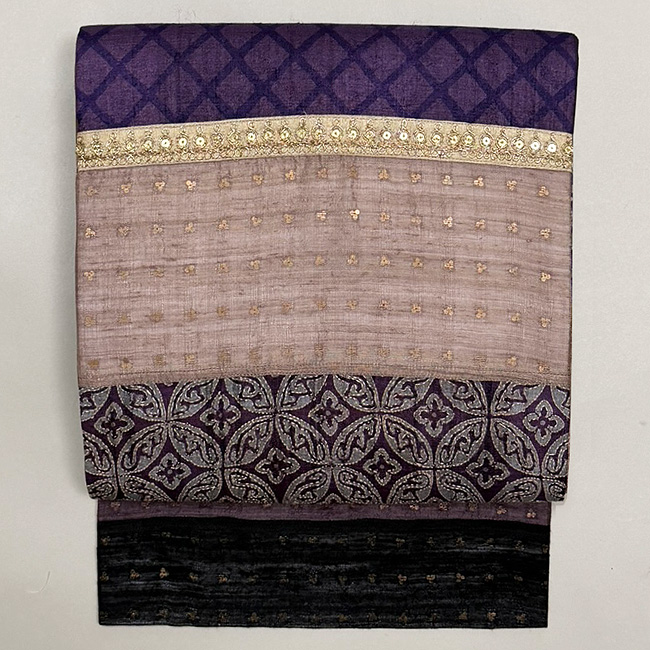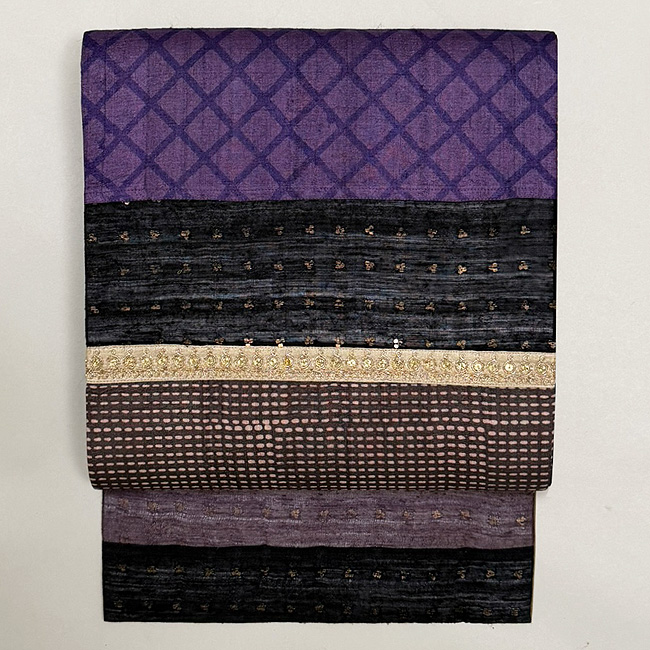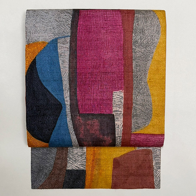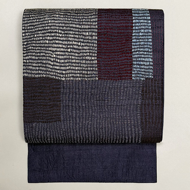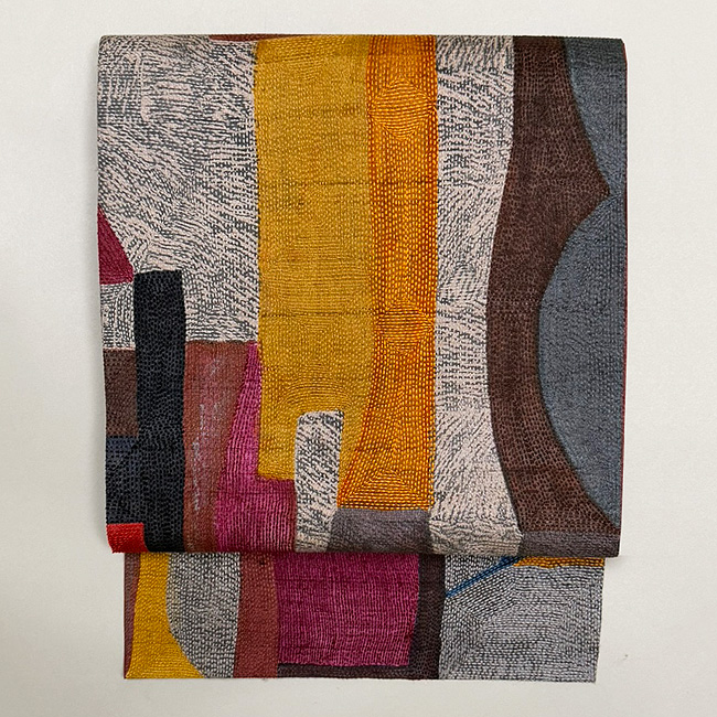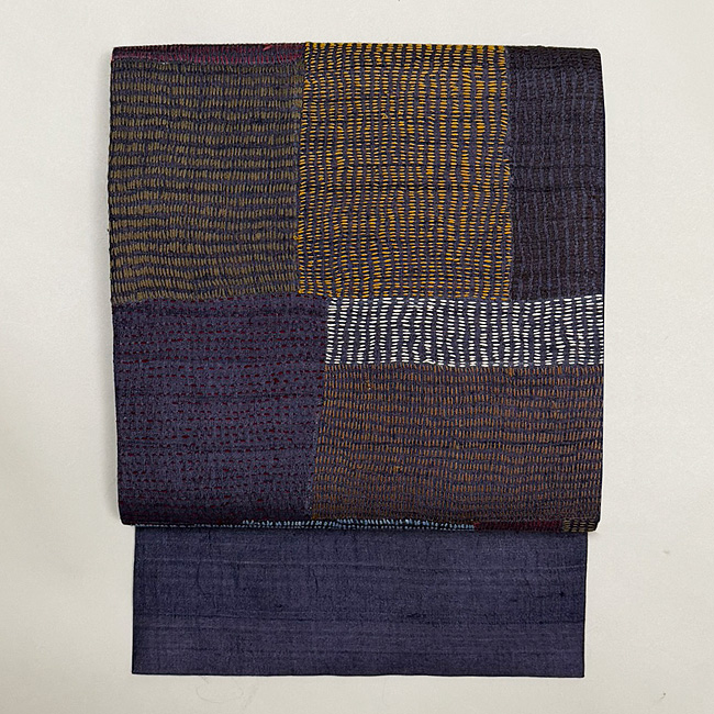 パッチワークのように大小の四角いスペースをブロックプリントで染め上げて、その上を様々な色でカンタワークした帯。
