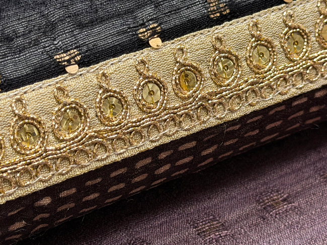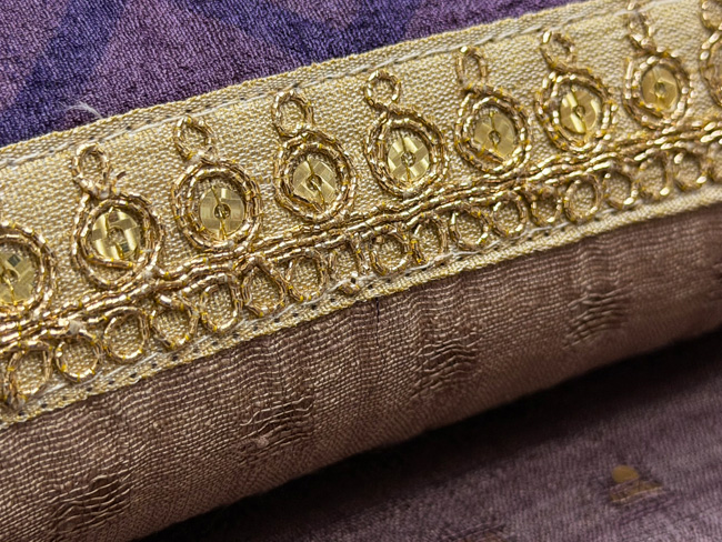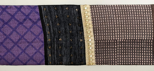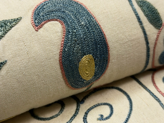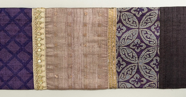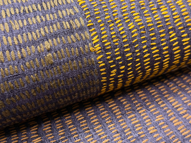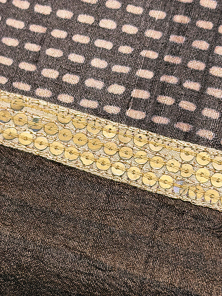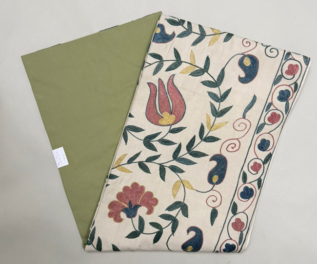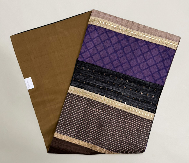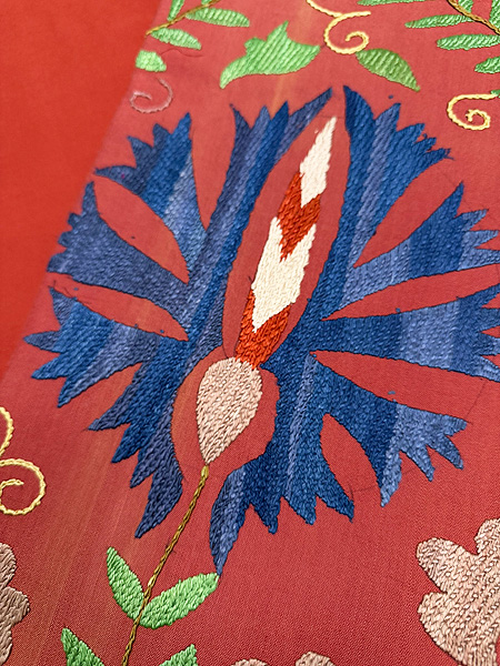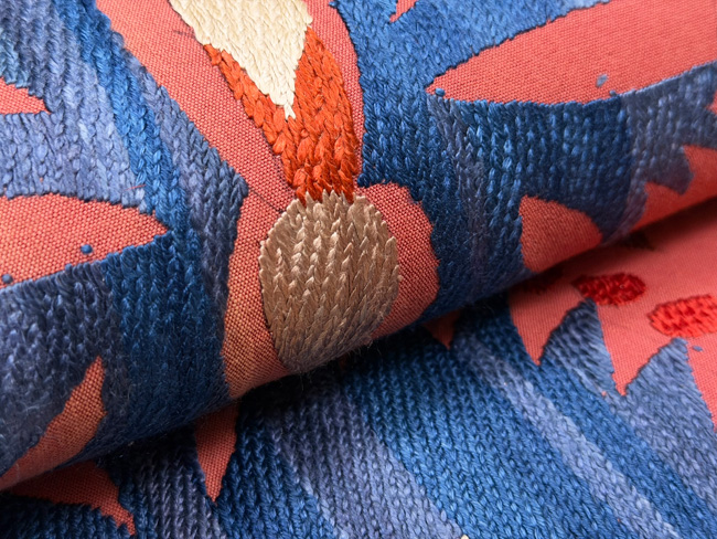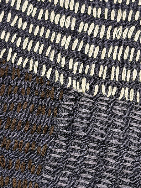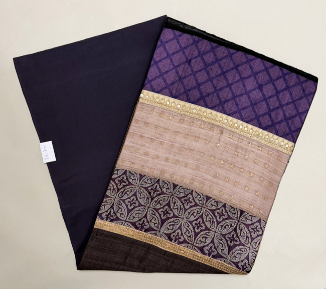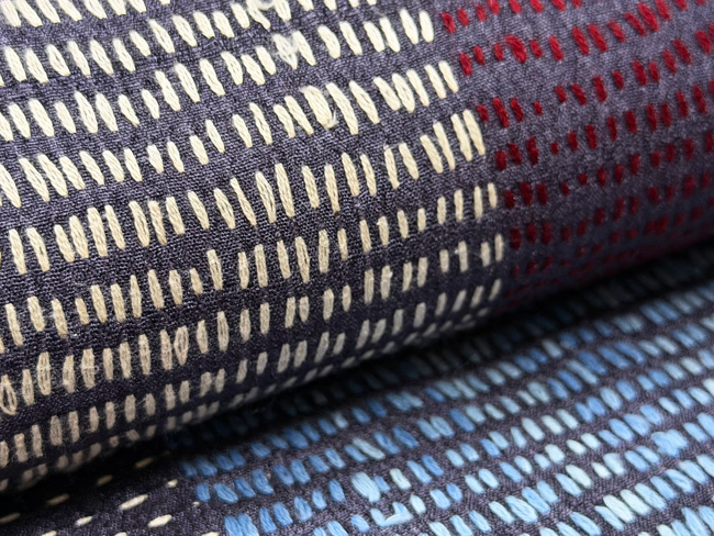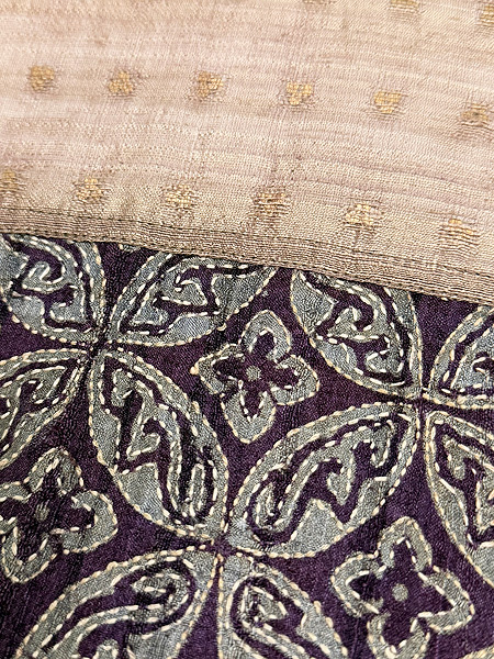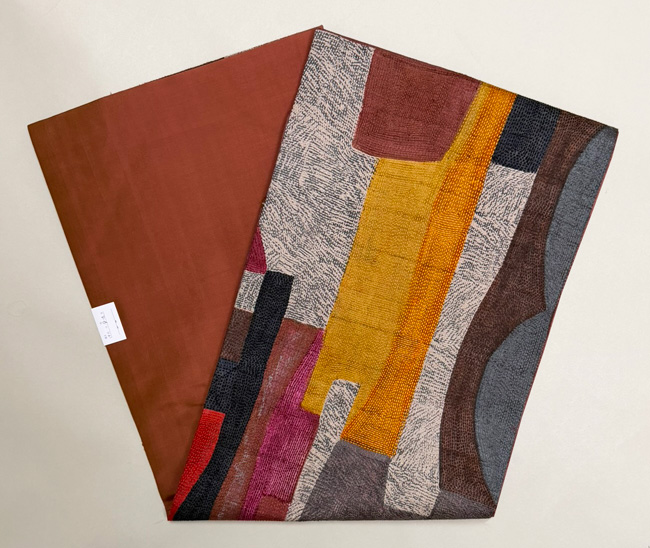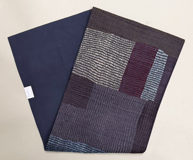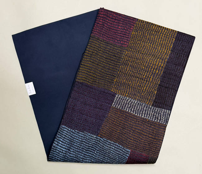 ブロックプリントで抽象画のように染め分けたその上に地色と合わせたカンタワークを施しています。