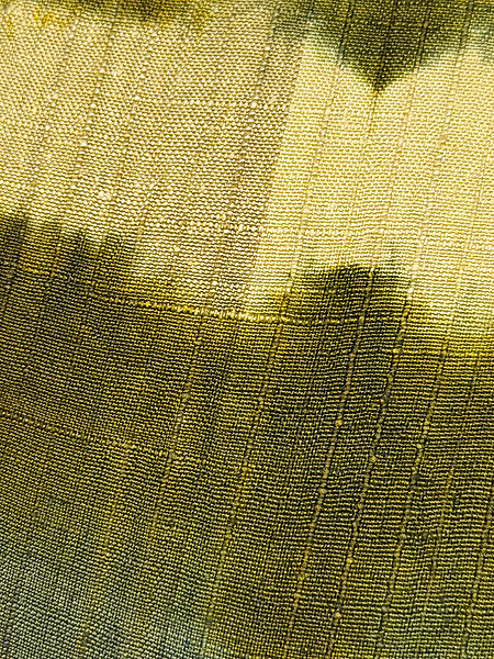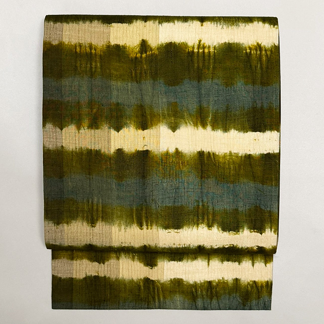よもぎ色に青磁色が重なって、大胆で深い表情の名古屋帯です。