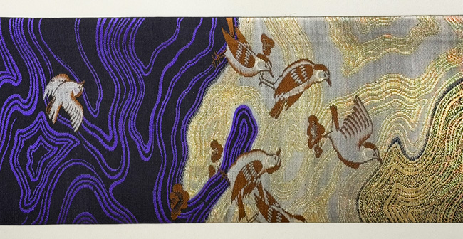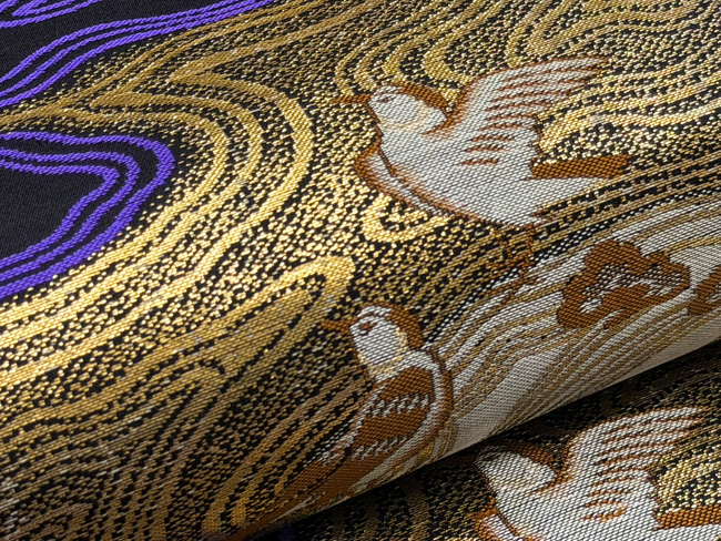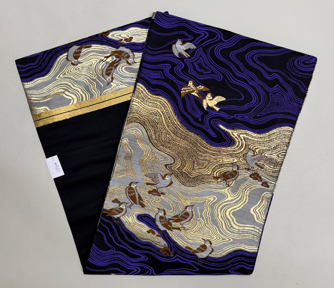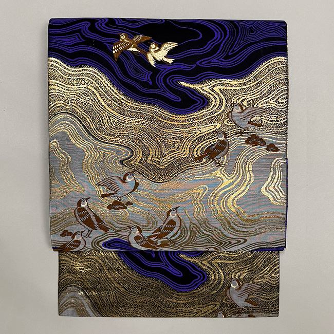 流れるような曲線に遊ぶ千鳥たちがかわいい名古屋帯です。