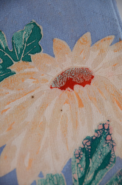 ろうけつ風のやさしい表現で、大輪菊が咲き誇っています。