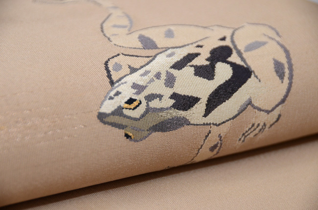 織り文様を継ぎわせました。開き名古屋にしましたので、前巾を広くお召しいただけます。