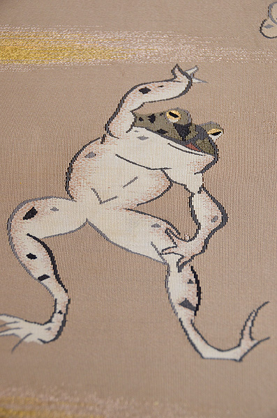 背景には、紗綾形に笹の、これも大きな地紋様が見られます。
